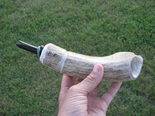 I made myself a howler yesterday. It was nice to turn one out again. It's elk antler powered by a Carver toneboard. I couldn't put the clearcoat on yet because it was to cold and it wouldn't cure up good. Because of that, I couldn't glue in the toneboard either, so I wrapped it in electrical tape to give it a snug fit!